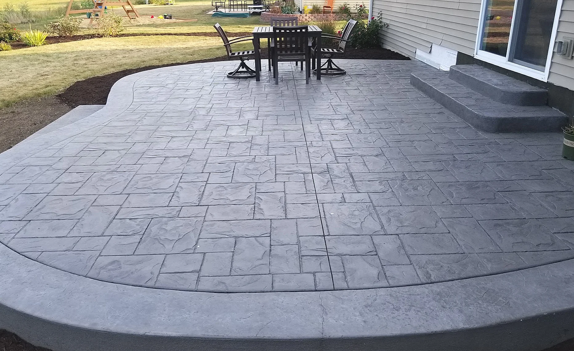 Stamped concrete ashlar pattern is very popular because of its classic and decorative touch. After doing tons of research on stamped concrete designs and colors we selected the ashlar slate stamp in light grey for our backyard patio. Landscaping Brick Pavers Stamped Concrete Retaining Walls Decks Gazebos Pergolas Seawalls.